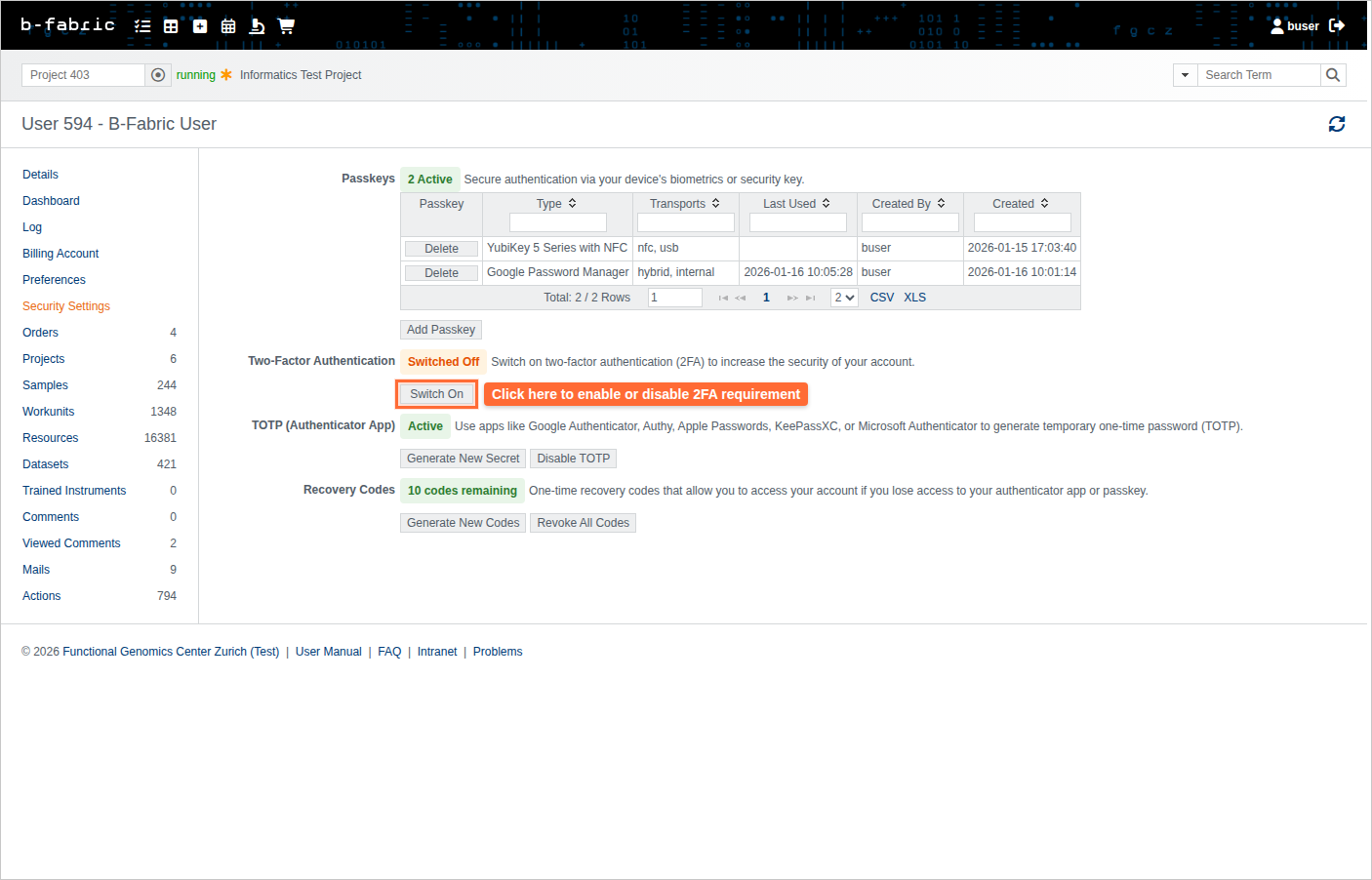 - Navigate to your user profile and click the 'Two Factor' tab.