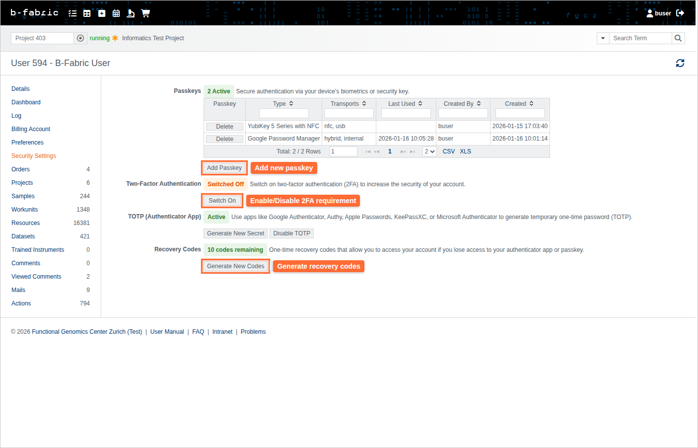 Two-factor authentication adds an extra layer of security to your B-Fabric account. You can protect your account using passkeys, authenticator apps, or both.