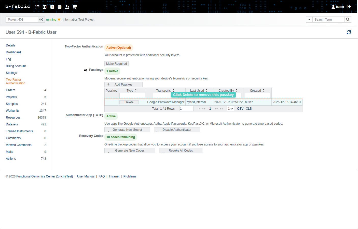 3. Click the delete button next to the passkey and confirm the removal.