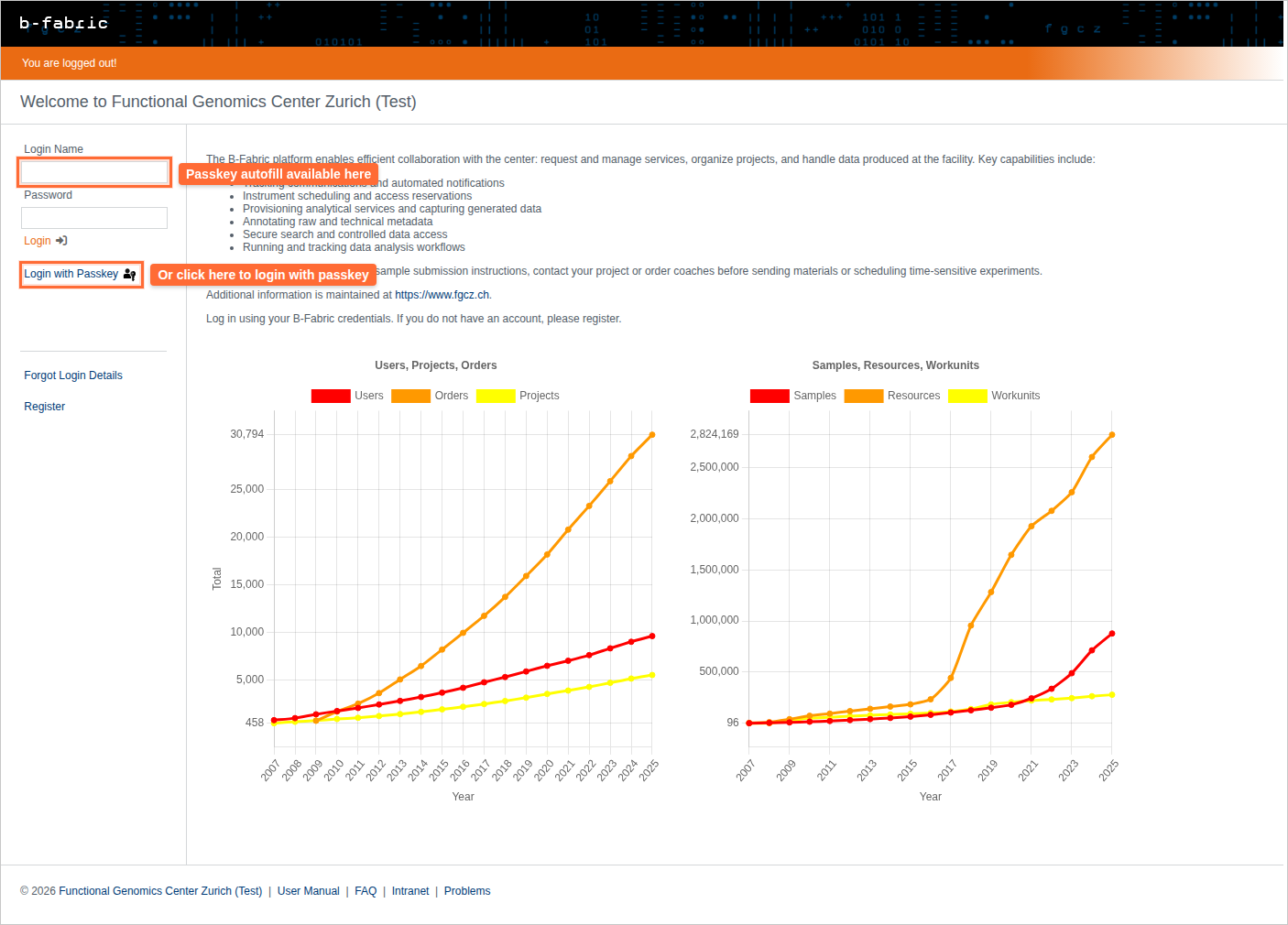 Your browser might suggest a passkey as an autocomplete option, or you can click the 'Login with Passkey' button.