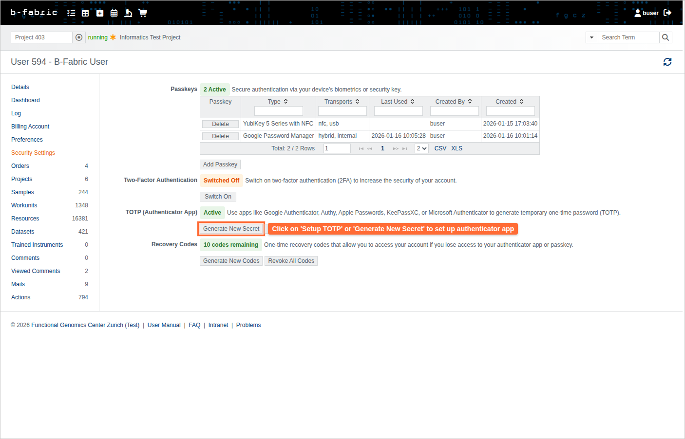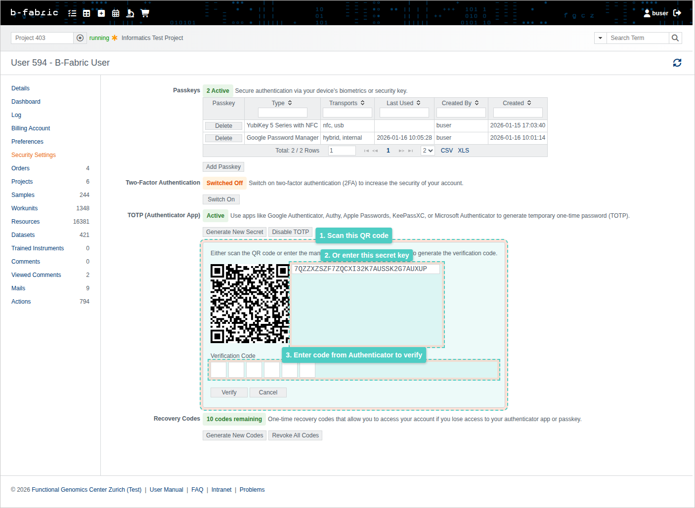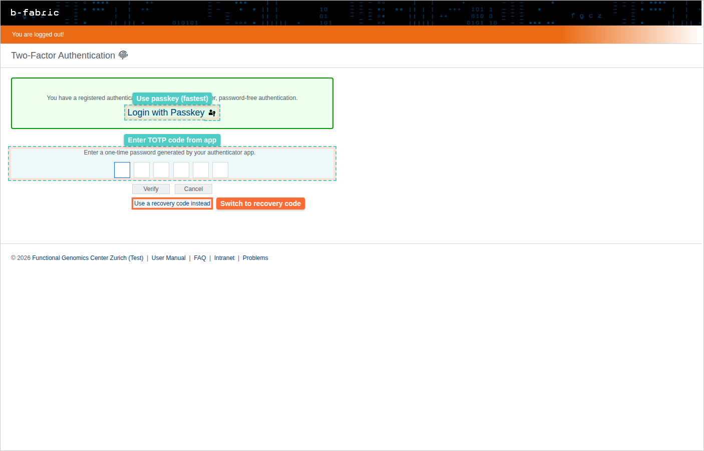 1. Go to the B-Fabric login page and enter your username and password.2. After submitting, you'll be taken to the 2FA authentication page.