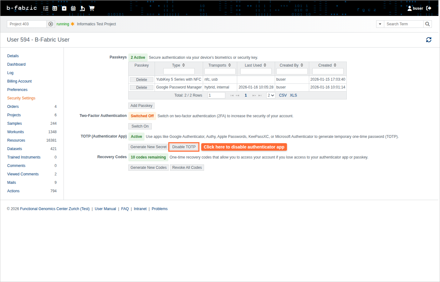 Note: You cannot disable TOTP if you have no other 2FA method and no recovery codes.